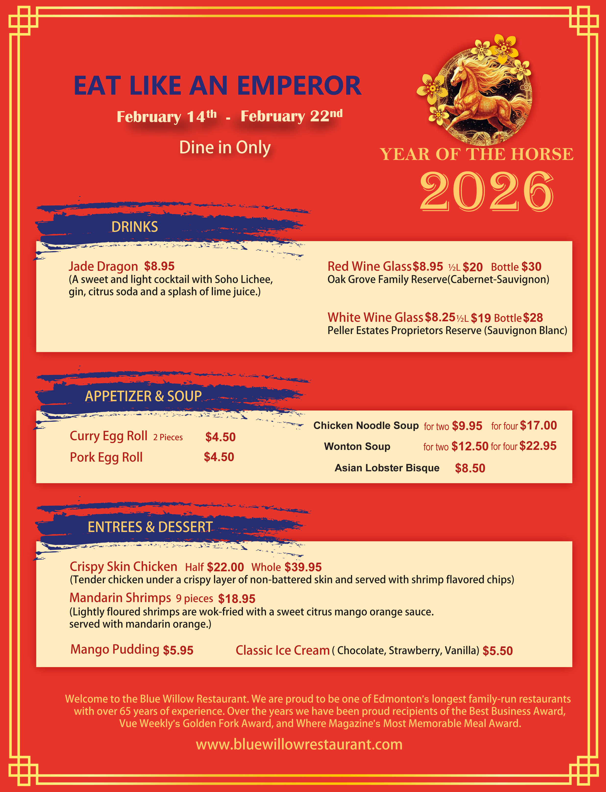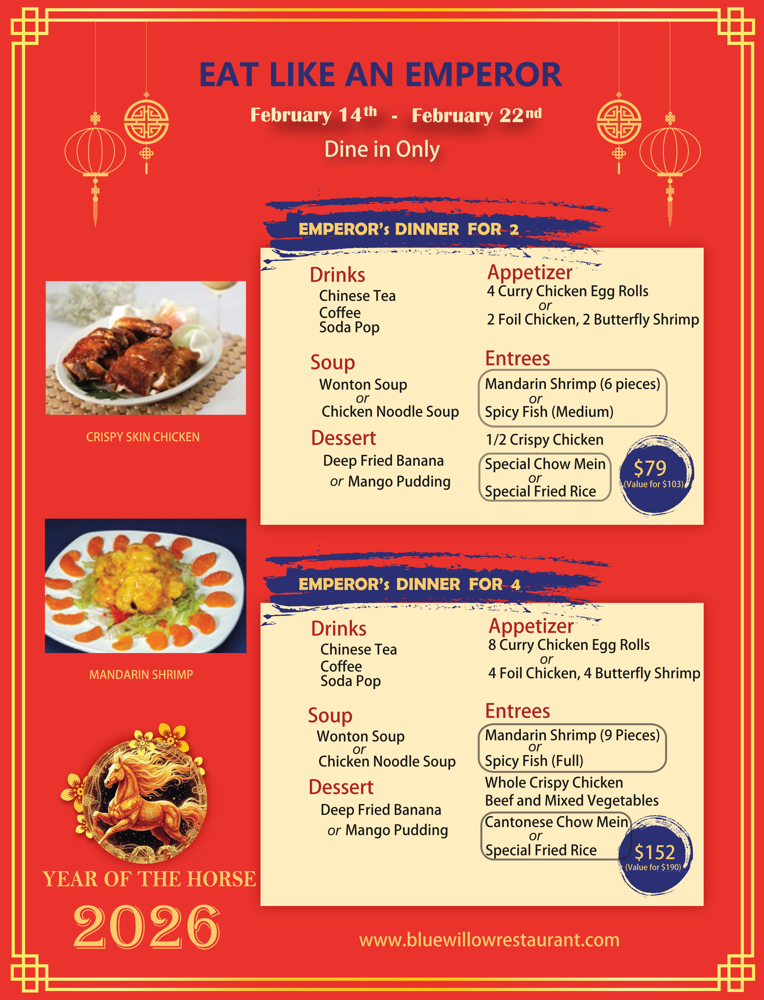 For February 14th, you can dine in and enjoy Blue Willow’s Dinner for Two for only $45 or you can order from our “Eat Like an Emperor” menu.